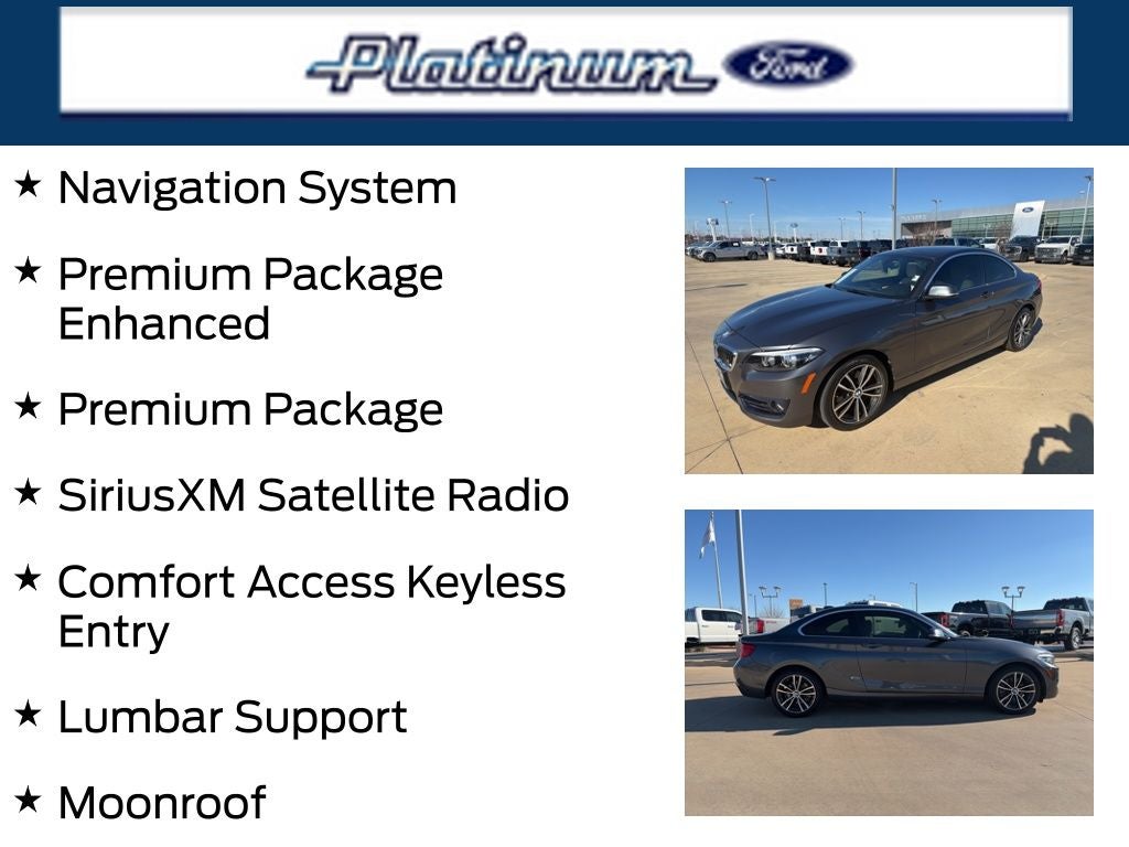Imagine yourself behind the wheel, surrounded by the 2 Series' premium features and advanced technology. The Navigation System and SiriusXM Satellite Radio will keep you connected and entertained, while the Comfort Access Keyless Entry and Heated Steering Wheel add an extra touch of convenience and comfort.