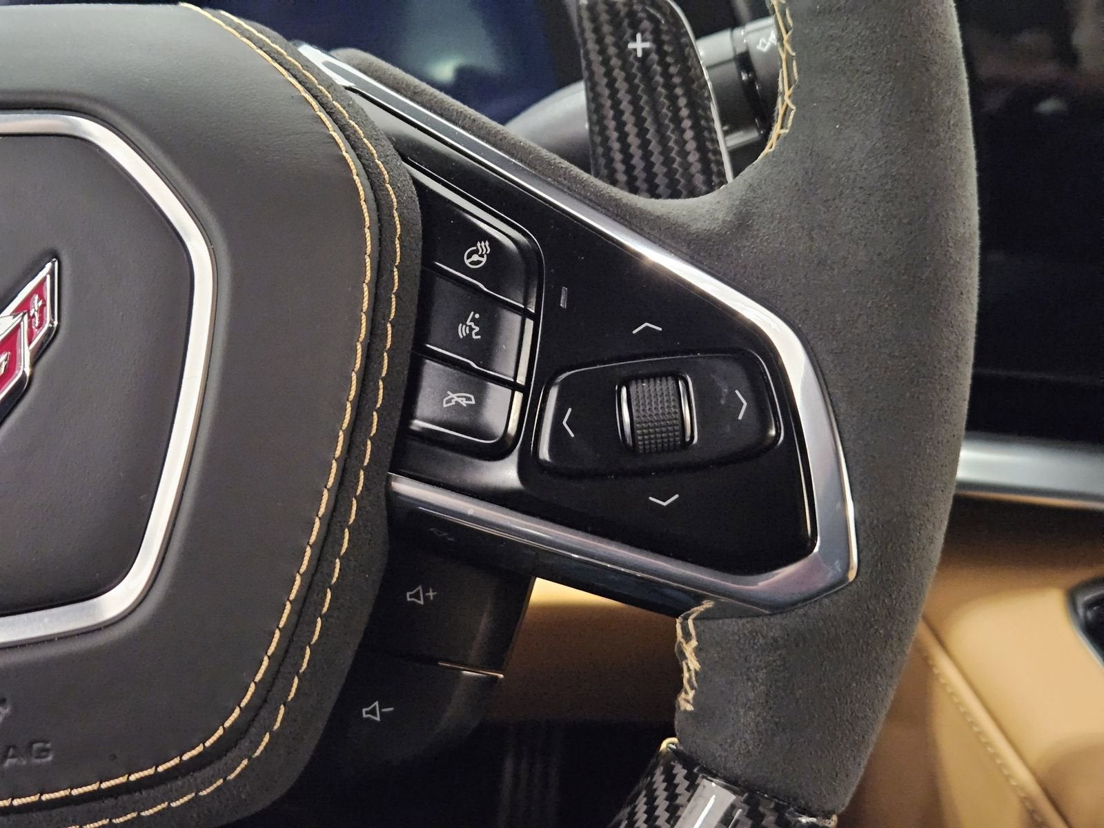 - Carbon fiber and sueded microfiber-wrapped steering wheel