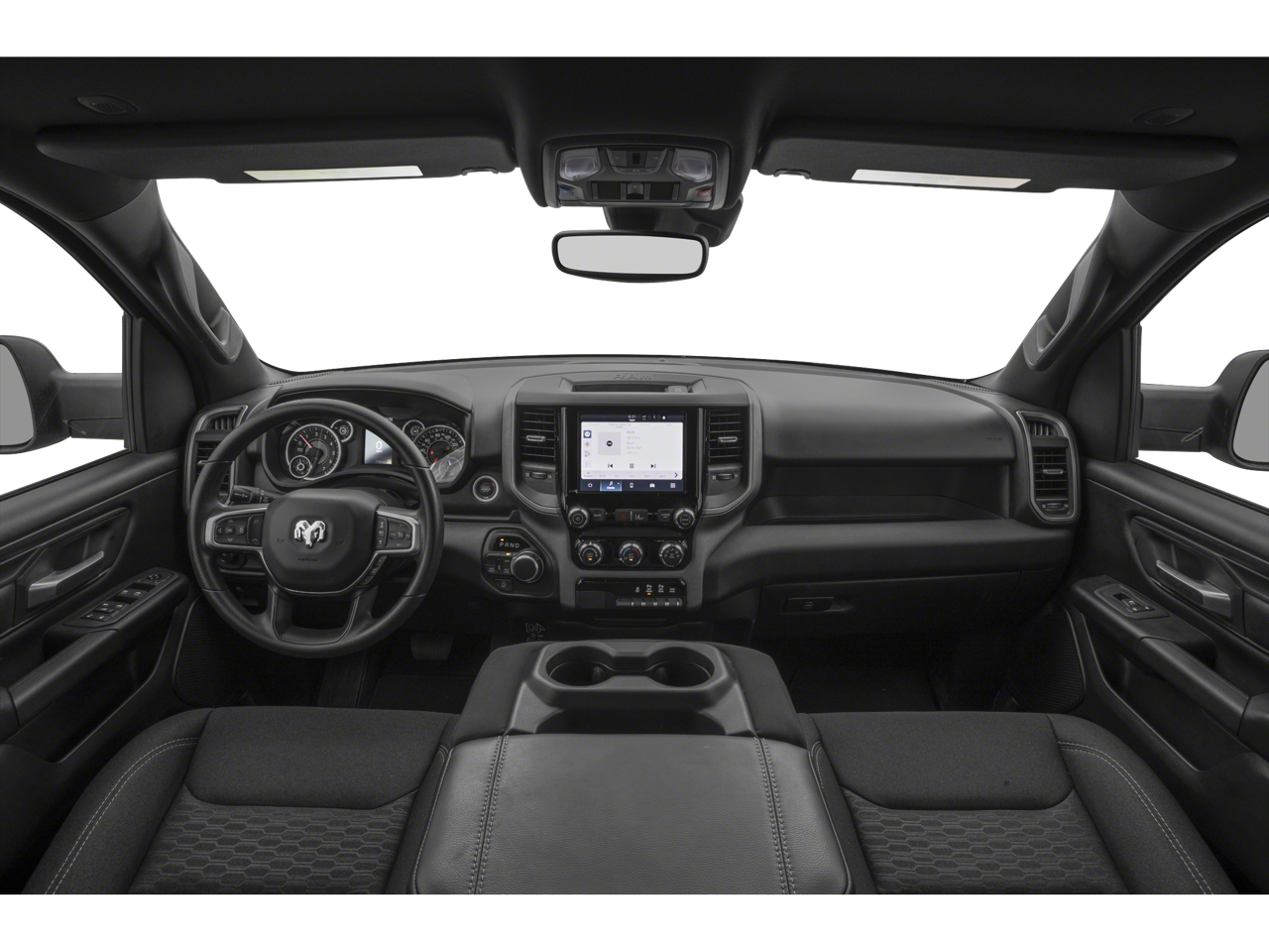 Inside the Crew Cab, the cabin is functional, comfortable, and thoughtfully designed. Cloth bucket seats provide supportive seating for daily driving, while the rear seat and in-floor storage bins add versatility for passengers and cargo. Technology is centered around the Uconnect 5 infotainment system with an 8.4-inch touchscreen, offering smartphone integration, hands-free connectivity, and intuitive access to vehicle settings.